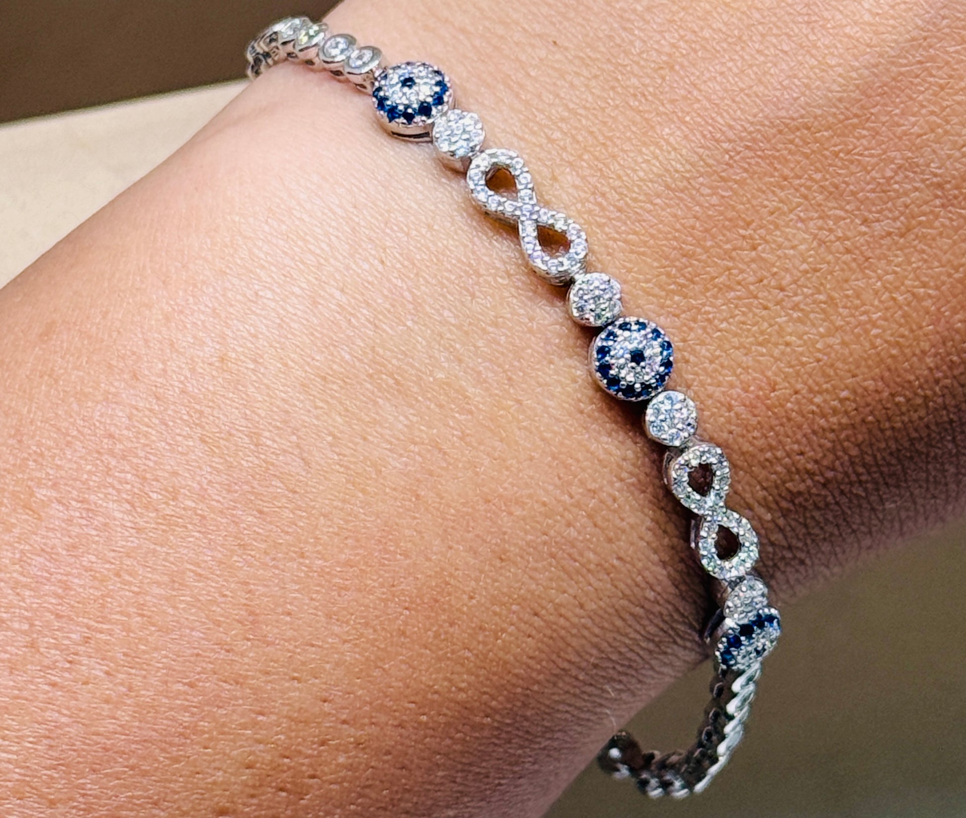 Sterling silver 925 exquisite evils eye tennis bracelet. With infinity and tube design. Such an exquisite piece of jewellery.